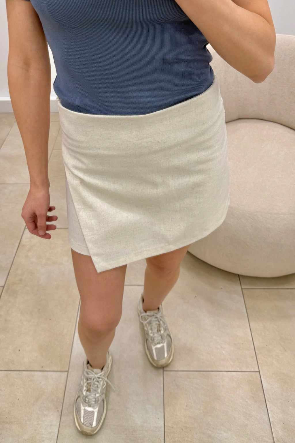 Short Pollera de Lino Sastrero. Pinzado en la parte trasera y bolsillo falso ojal. Cierre al costado.